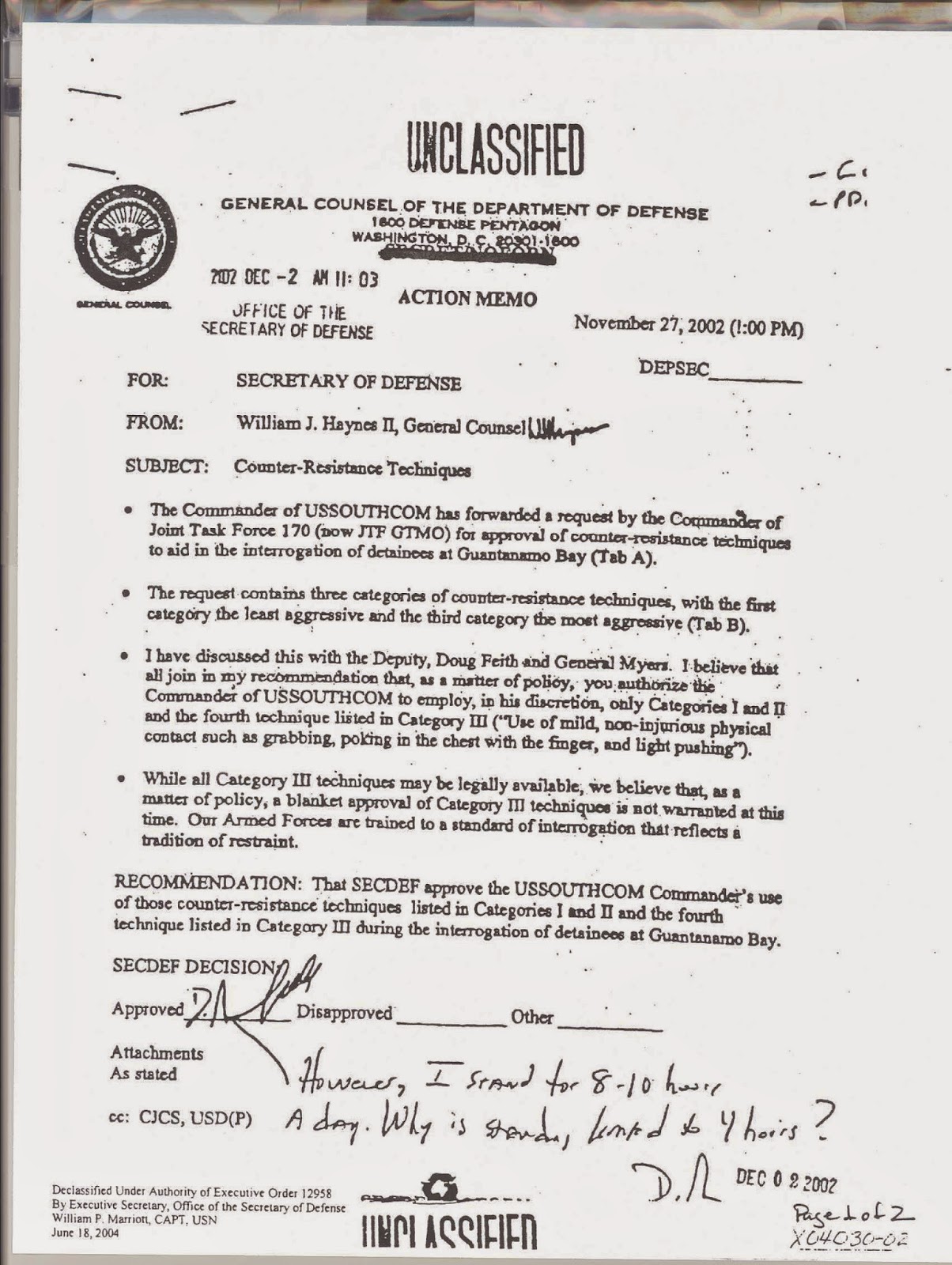 In 2002, Miller requested the use of harsher interrogation techniques in a memo to the Secretary of State. The enhanced techniques he was requesting the use of included sensory deprivation techniques like extreme noise, solitary confinement, limited light or darkness, the use of stress positions, the use of phobias against the prisoners, and the removal of clothing. Not only did Donald Rumsfeld approve Miller's techniques in his Action Memo of November 27, 2002 but questioned the restraint being used during interrogations.